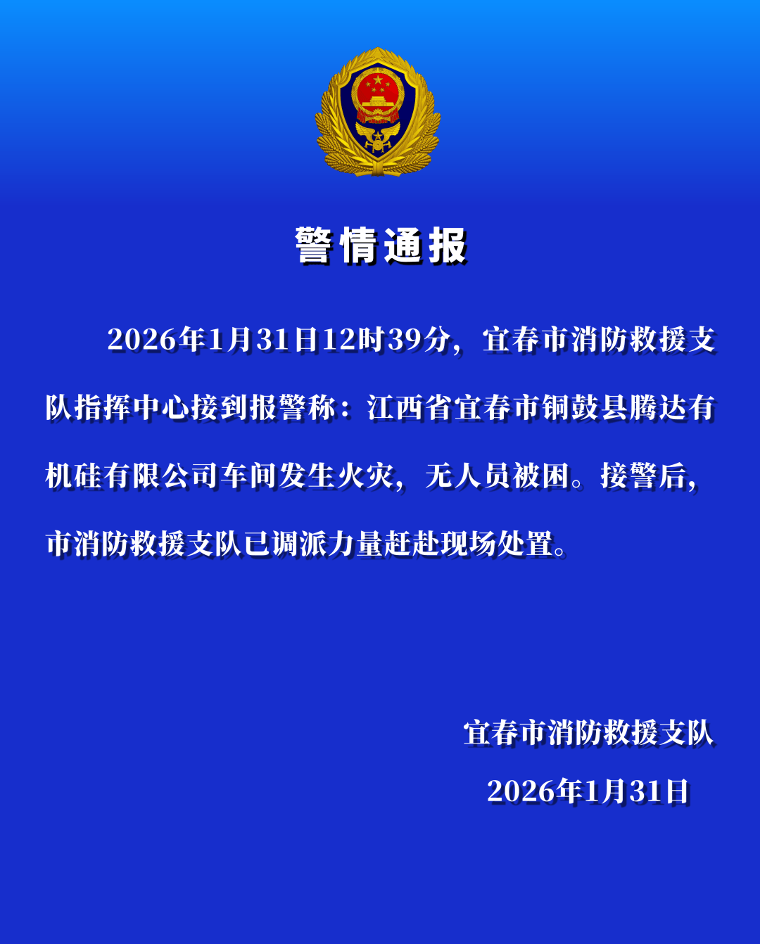 当日下午,宜春市消防支队发布警情通报:2026年1月31日12时39分,江西省宜春市消防救援支队指挥中心接到报警称:江西省宜春市铜鼓县腾达有机硅有限公司车间发生火灾,无人员被困。接警后,宜春市消防救援支队已调派力量赶赴现场处置。